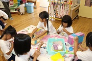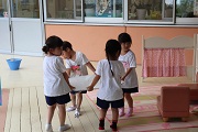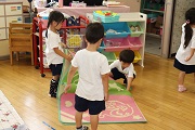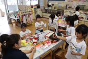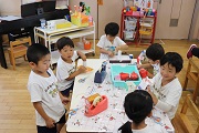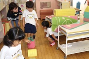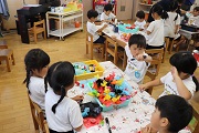 4歳児ぱんだ組のみんなは、室内に大型積み木を使って迷路をつくり、遊びました。順番を守って遊ぶことができています。集団生活のルールもしっかり守れるようになってきています。成長。5歳児ばら組のみんなは、お店やごっこの準備で自分たちで決めたお店の商品を協力しながら作成しています。来週の保育参観のとき、お母さんたちにお客様になっていただきます。本当によく協力して商品づくりができています。成長。