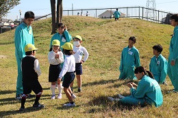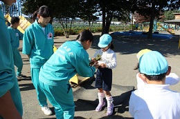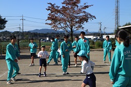 10月24日(月)は穏やかな秋の日差しのなか、3年生5組のみなさんが来園して、園児と遊んでくださいました。今日は5歳児と中学生の日だったのですが、4歳児の園児たちもお兄さん先生やお姉さん先生に甘える姿が見られました。小さな子どもたちなので、我慢も多かったと思いますが、笑顔で元気に接していただき、感謝しています。芝山でぽかぽか日差しを浴びながら過ごす姿やドッジボールを楽しみました。お姉さんが採ってきてくれたおおばこの茎で相撲をとって遊んだり、園児たちも遊びを学んでいました。