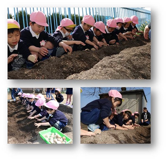 今日は、きりん組(年中児)のみんなで、園の中にある小さな畑にジャガイモを植えました。ていねいに穴を掘ってジャガイモを植え、やさしく土をかけてあげました。いっぱい収穫できるといいですね(^o^)