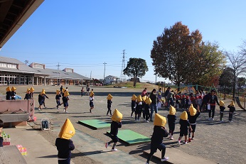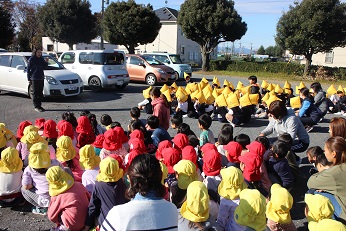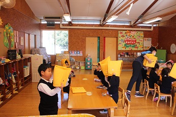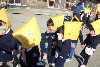 11月27日(月)は火災を想定した避難訓練を実施しました。放送を聞いた園児は、「先生の指示を聞いて」がきちんとできるようになりました。あわてず、先生の指示で避難を開始しました。すばやい避難で、口や鼻から入る煙を防ぐハンカチやタオルをもって、火事から身を守り、命を守るための訓練です。真剣に練習に取り組むことができていました。