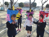 今日は幼稚園でも豆まきをしました。例年は寒い中ですが、今日は陽もあり過ごしやすい中で豆まきができました。