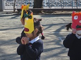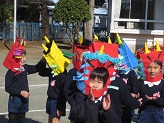ご家庭でも豆まきをやると思いますが、園児のお面を使って、大きな声で悪い鬼を退治してください。