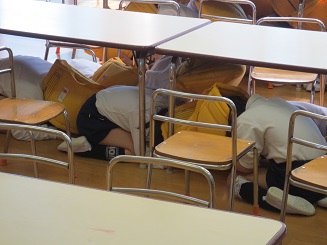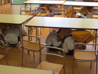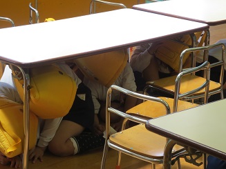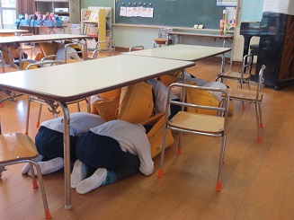 本当の地震がきたら、ゆれて怖いでしょう。「キャー」の騒ぐ声を出せば助かるのではなく、全員の安全な行動を身につけることです。