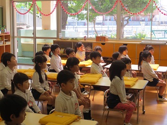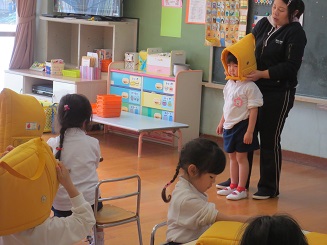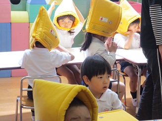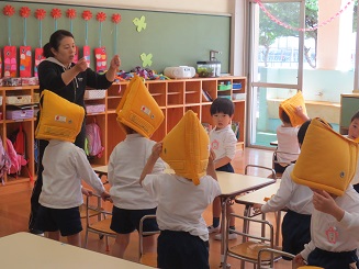 4歳児のみんなは初めて、防災ずきんのかぶり方、机の下に潜り頭・体の守り方をを学び体験しました。 さらに、落ち着いて行動するするために、静かに先生のお話(指示)を聞くことです。