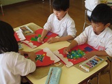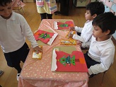 これ一つとっても、様々な技能、アイティア 丁寧さ それぞれの自分の持っている力を高めます。 いつも楽しく作るみんなですが、どんなお菓子がプレゼントとして入るのか、わくわくわしながら、心楽しませながら完成しました。きっと、そ品物よりも、楽しみ自体がクリスマスの喜び