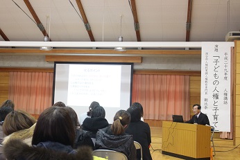 1月22日(月)は、みらい幼児園おかべとおかべ幼稚園の5歳児の保護者を対象にした、合同の「人権講話」を実施しました。講師は深谷市人権政策課人権教育専門員の朝比奈幸三先生です。演習や具体的な事例をあげていただきながら、わかりやすく守るべき子供の人権についてお話しいただきました。特に、入学を間近に小学校の先生から「身につけておいてほしいこと」、また、園児や保護者の立場から「身に付けておいてよかったこと」「身につけておけばよかったこと」など、これから間に合う準備にも触れていただき、保護者の方にも有意義な時間となったと思います。