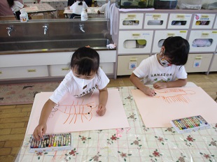 「ハサミの形は?」「ハサミのところに黒い点々があるね」「足は何本かな?」